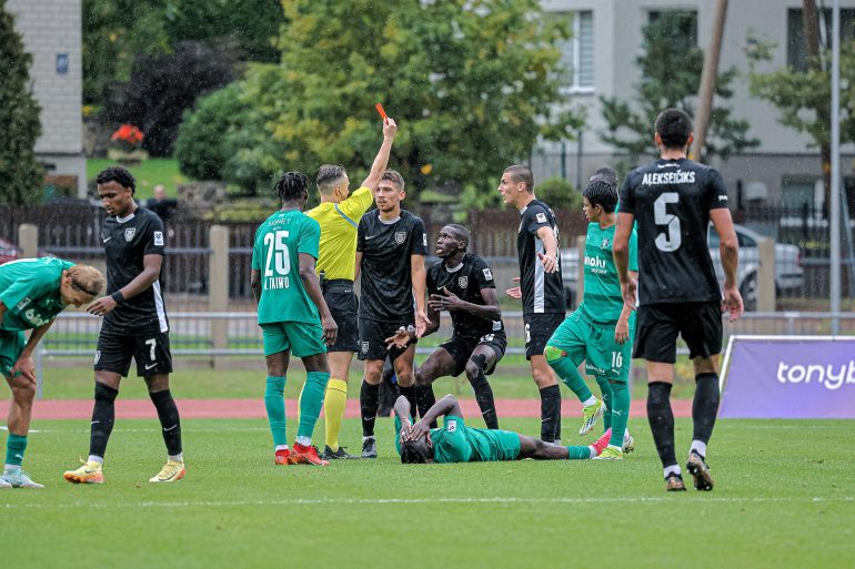 The game took a dramatic turn at the end of the first half when Auda equalized, followed by the dismissal of Valmiera’s defender Maksims Toņiševs, who received a second yellow card. Maksims was shown the card after angrily reacting to a questionable referee decision that wrongly went against him – the ball had been cleared out of bounds by the opponent, not by Maksims.