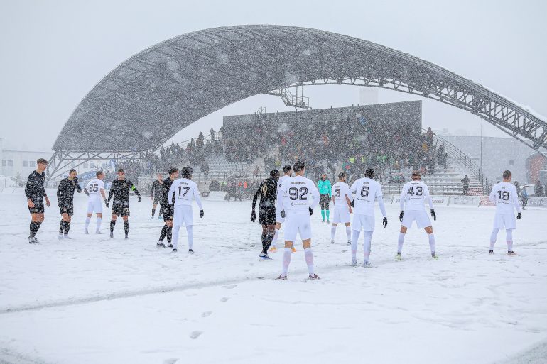 There was a lot of shoveling happening on the pitch. Much more than football itself, given the circumstances. The first half of the game was relatively quiet. No real chances on either side as teams battled each other in the middle part of the pitch.